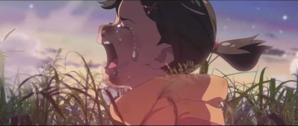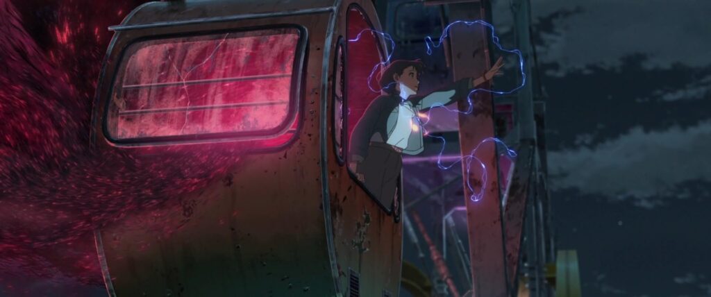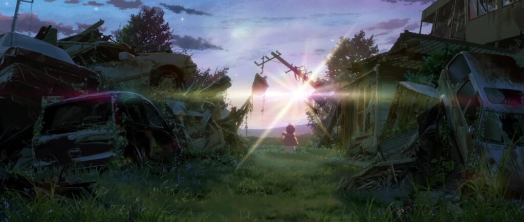 新海誠以一種極其細膩的方式,在虛構與現實之間架起橋梁。那些地震前的聲音——小朋友的笑聲、家人的叮嚀、老師的訓誡——隨著門被關上的一瞬間,彷彿凍結在時空之中。它們不是幻覺,而是真實的證據,證明那些曾經存在、曾經愛過、曾經說了再見的人。